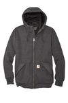 • This rain-blocking hoodie is work-ready. • 10.5-ounce, 50/50 cotton/poly blend or 59/41 cotton/poly blend with Rain Defender durable water-repellent finish (Black, Carbon Heather, New Navy)* • 100% polyester thermal lining retains warmth • Attached thermal-lined three-piece hood with drawcord closure • Full-length brass front zipper • Two front hand warmer pockets with flaps for added security • Stretchable, spandex-reinforced, rib knit cuffs and waistband • Interior pocket with zipper closure • Hidden media pocket • Locker loop • Carhartt label sewn on left hand warmer pocket • Loose fit • *Please note: Select colors in Carhartt fleece are currently transitioning from a 50/50 cotton/poly blend to a 59/41 cotton/poly blend. Weight and fabric properties remain the same. Your order may contain a combination of both fabrics.